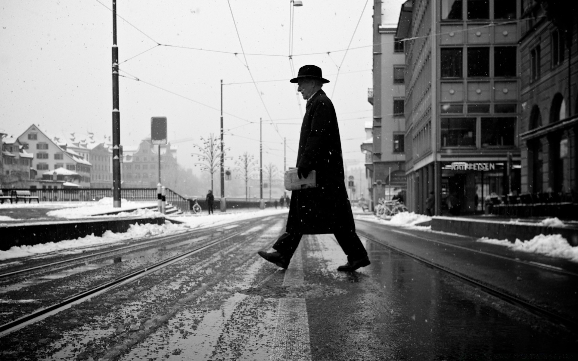 Schwarz-Weiß-Bild eines Bahnübergangs