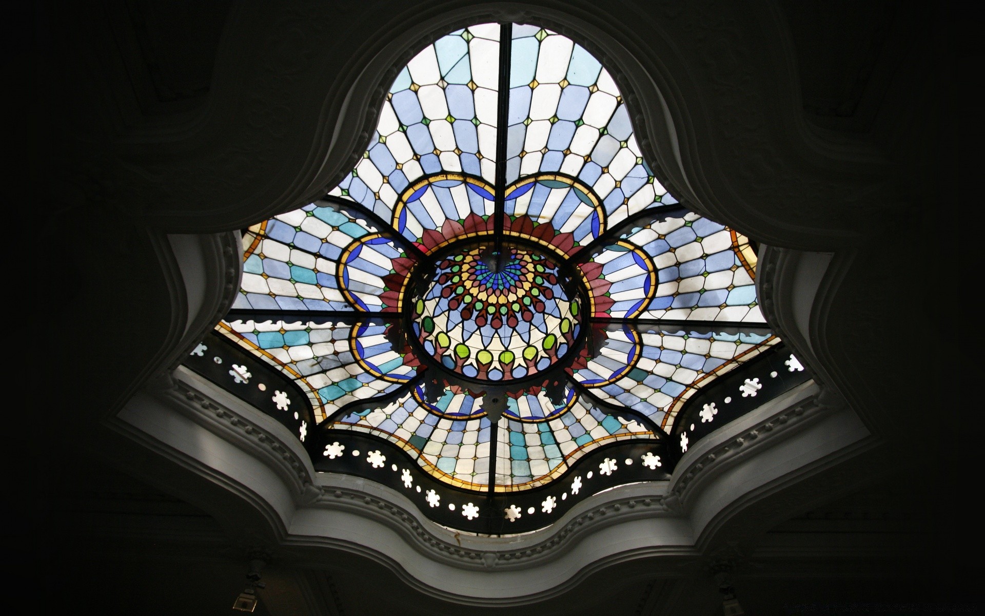Innen ist die Decke des Gebäudes mit einer aufwendigen Kuppel mit farbigem Glas verziert
