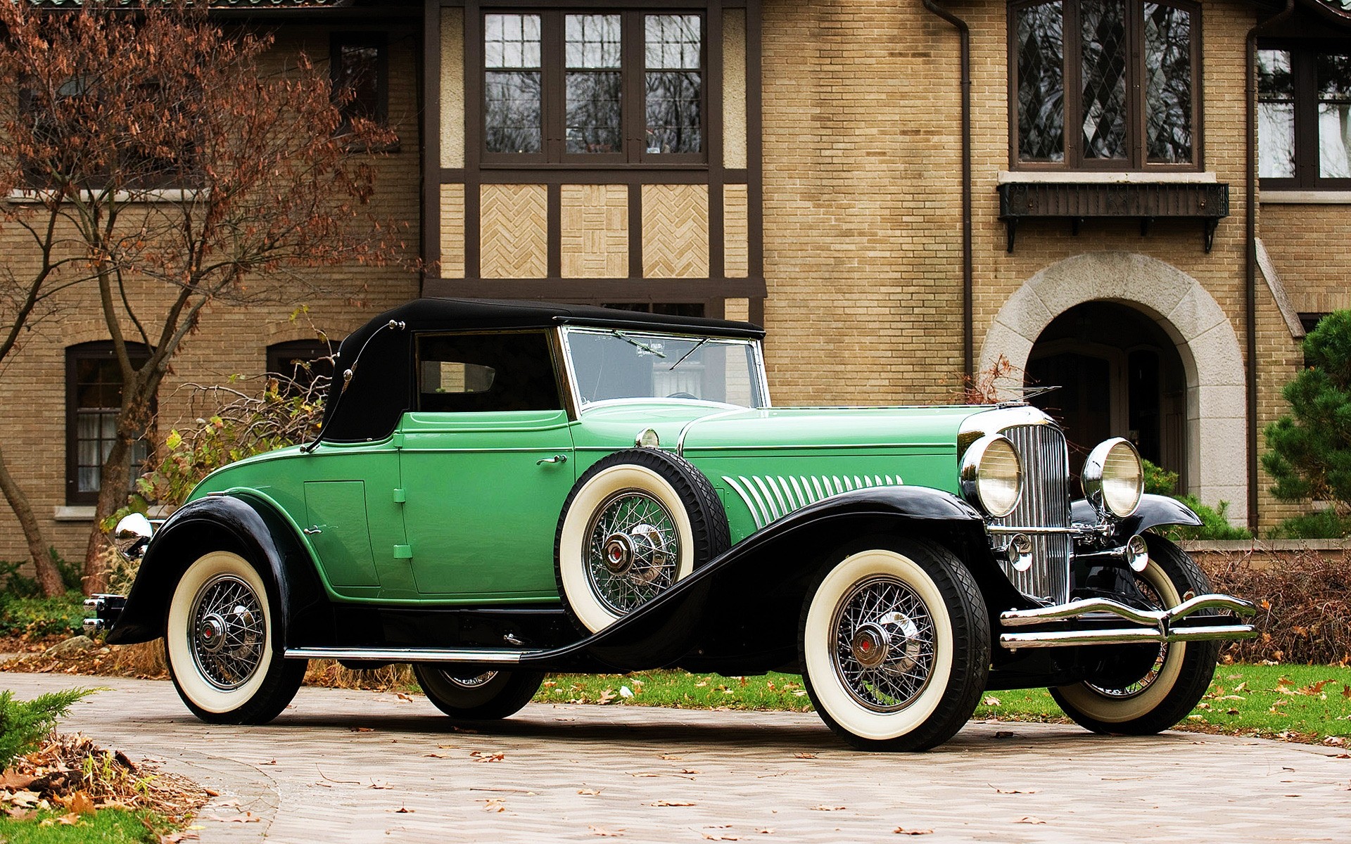 Ein grüner Pkw aus dem frühen 20. Jahrhundert mit klappbarem Oberteil und zwei Insassen