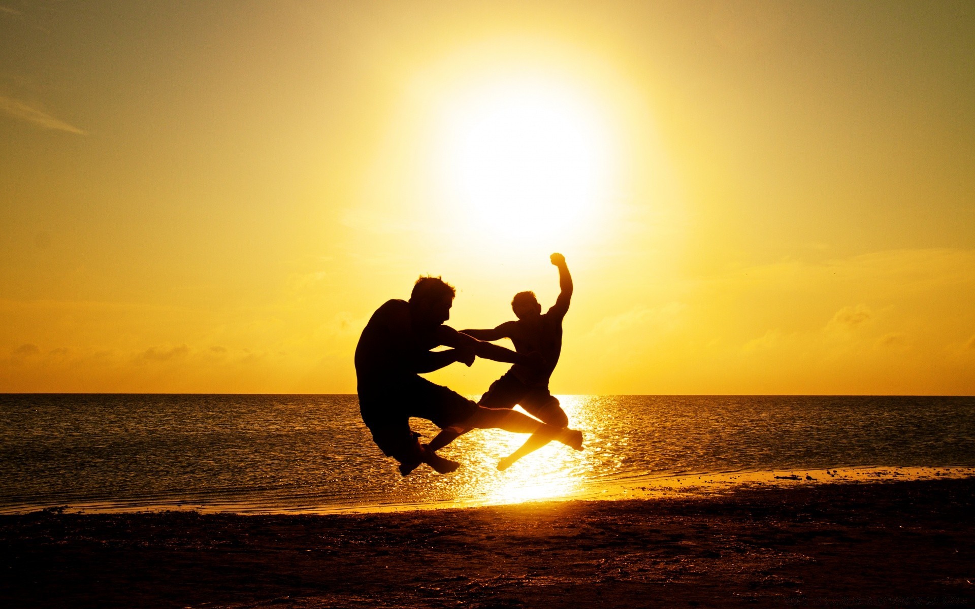 Zwei Athleten springen am Strand